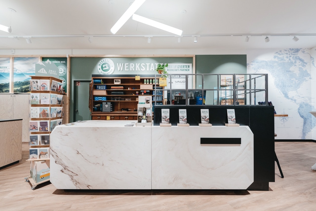 Der neue Store bietet eine Reparatur-Werkstatt in der fachkundige Mitarbeiter defekte Bekleidung, Rucksäcke oder Zelte direkt vor Ort reparieren. Auch der verstärkte An- und Verkauf von 2nd-Hand-Artikeln ist fester Bestandteil des Store-Konzepts. Gebrauchtes Equipment wird sorgfältig geprüft, aufgearbeitet und mit der gewohnten Globetrotter-Gewährleistung angeboten. Ziel: Die Lebensdauer der Produkte verlängern und den ökologischen Fußabdruck reduzieren. Besonders sichtbar wird der Nachhaltigkeitsanspruch im Store-Design, das von der Konrad Knoblauch GmbH mit Sitz in Markdorf/Bodensee geplant und realisiert wurde. Statt neue Möbel anzuschaffen, setzt Globetrotter auf Re- und Upcycling von Lagerbeständen.