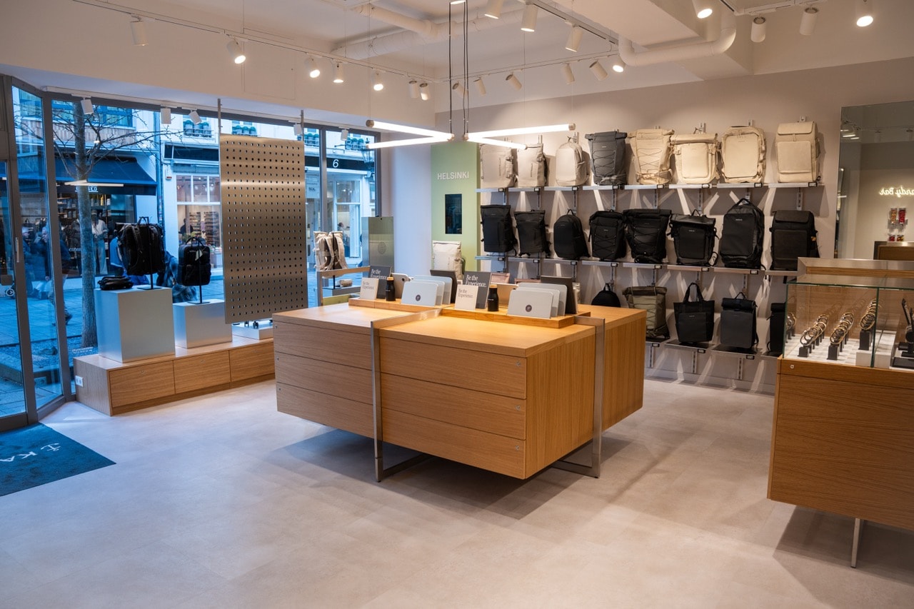 Nach der erfolgreichen Einführung des neuen Store-Konzepts in Köln setzt Kapten & Son nun auch in diesen beiden Metropolen auf ein interaktives Einkaufserlebnis, bei dem Kundinnen die Produkte nicht nur betrachten, sondern aktiv ausprobieren können. Im „Experience Store“ stehen den Kunden verschiedene interaktive Stationen zur Verfügung. Der Magic Mirror ermöglicht es, sich selbst von hinten zu betrachten – eine Funktion, die besonders für Rucksack-Käuferinnen von Interesse ist. Am Packing Table können die Modelle mit Laptops, Wasserflaschen und anderen Dummies bepackt und in voller Größe ausprobiert werden. Der Size Check gibt Aufschluss darüber, welche Rucksäcke und Taschen als Handgepäck durchgehen – ein praktisches Feature für Vielreisende. Optisch bleibt das Store-Design dem modernen und minimalistischen Stil mit hochwertigen Materialien und grünen Markenelementen treu.