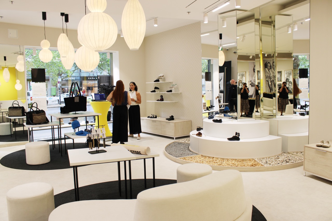 Der Store in Berlin verfügt über eine Verkaufsfläche von 96 Quadratmetern. Beim Ladenbau wurden natürliche Materialien wie beispielsweise Massivholz und Naturkiesel aus Deutschland verwendet. Die Wandbespannungen sind PVC-frei, bestehen anteilig aus wiederverwerteten Werkstoffen, Naturfasern oder anderen umweltfreundlichen Substraten und stammen gleichwohl von einem deutschen Anbieter. Die Auswahl der Materialien sowie deren kurze Transportwege standen bei der Planung im Vordergrund. Die Verspiegelungen wurden so angeordnet, dass sie die Helligkeit im Laden duplizieren, so dass insgesamt weniger Lichtquellen benötigt werden.